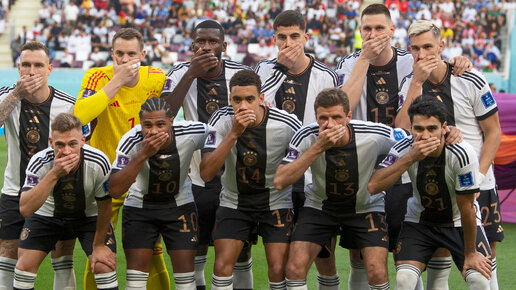 Своеобразная акция протеста против катарских порядков. Читайте также Сборная Германии стартовала на ЧМ-2022 в Катаре с политического заявления. Все произошло не во время матча с Японией, а перед самым его началом. Во время командного фото немецкие футболисты закрыли рты рукой. Что значит этот жест «Твиттер» сборной Германии по футболу расшифровал послание игроков: «Речь шла не о политическом заявлении — права человека не подлежат обсуждению. Это следует принять как должное, но это все же не происходит...
