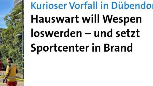 📌 " Пожар в спортивном центре Шумахер в Дюбендорфе в прошлом году устроил сторож. Мужчина использовал огонь и легковоспламеняющийся спрей от насекомых, чтобы удалить осиное гнездо. Был нанесен материальный ущерб на общую сумму около 311 000 швейцарских франков. Никто не пострадал: все 75 человек, находившиеся в здании, смогли спастись. В результате прокуратура вынесла постановление о наказании. Мужчина нарушил свою обязанность по уходу. Можно было предвидеть, что огонь и легковоспламеняющийся аэрозоль могут вызвать пожар на таком коротком расстоянии от фасада...