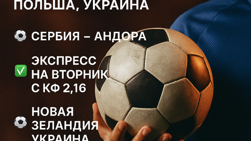 Привет! Во вторник нас ждёт насыщенный игровой день — сразу несколько интересных матчей сборных. Подготовлены ставки на топовые встречи и собран уверенный экспресс. Ниже всё разложено по полочкам. 📲 1WIN 📲 ZENITBET 🔹 Прогноз: Фора (+3.5) на Андору 🔹 Коэффициент: 1.65 🔹 Ставка: 3000₽ Сербы выиграли всего один матч из последних шести. В игре против Албании сыграли 0:0, и соперник был ближе к победе. Андора, несмотря на статус аутсайдера, борется до конца — уступила Англии всего 0:1, с Латвией 0:1, а с Мальтой сыграла вничью...