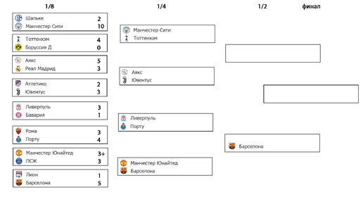 Привет дорогие друзья. Я подзабыл уже про схему турнира, которая была составлена ещё на стадии 1/8, так что сегодня мы ей воспользуемся, и нанесём на неё Барселону. Клуб пробилась в полуфинал. Надо отметить, что для команды выдался тяжелый месяц. Игра с Вильярреалом и Атлетико, с МЮ, затем с Уэской, которую не смогли обыграть вторым составом. И вот вновь встреча с Манчестером. Это же Барселона - скажите вы, ей не привыкать. Команде Сольскьяера также не позавидуешь. За 7 последних игр – 5-е поражение...