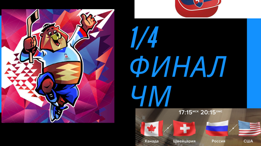 О проведении ЧМ. Стоит отметить, что с этого года пары формируются по другому распорядку. Стыкуются следующим образом. Команда занявшая первое место в группе встречается с командой которая заняла 4 место в другой группе. 2 место из одной группе с 3 местом из другой группы. И так далее. И сформировались следующие группы. Канада - Швейцария и Россия - США, которые пройдут в 17:15 мск. Финляндия - Швеци и Чехия - Германия, эти же встречи пройдут в 21:15 мск. Первые пары. Канада - Швейцария. Россия - США...