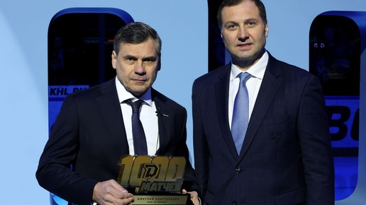 : – Сегодня мы чествуем человека-легенду, который первым среди тренеров достиг вершины в 1000 матчей в Лиге. Эта цифра символизирует стойкость, мужество, силу, любовь и преданность хоккею, за что мы благодарны Дмитрию Вячеславовичу. Также мы говорим ему спасибо за развитие игроков, клубов и Лиги, за удовольствие, полученное от игры его команд...