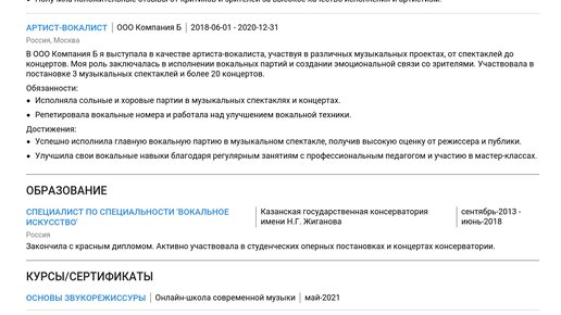 Пример резюме артиста-вокалиста 2025 - Как составить