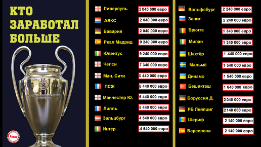 **** Здравствуйте, уважаемые любители Лиги Чемпионов. Сколько заработал на групповом этапе Зенит, Шериф, Шахтёр, Динамо и другие? **** Фиксированные суммы призовых, выплачиваемые клубам, выглядят следующим образом: Теперь подсчитаем доход каждого клуба. Группа «А». Если сравнить лидера с аутсайдером, то разница почти в 2 раза. В конце приведу общую таблицу, в которой узнаем, на каком месте Ман. Сити и ПСЖ по заработку. А сейчас смотрим группу «В». Разница между первой и последней командой составила 2,1 раза...