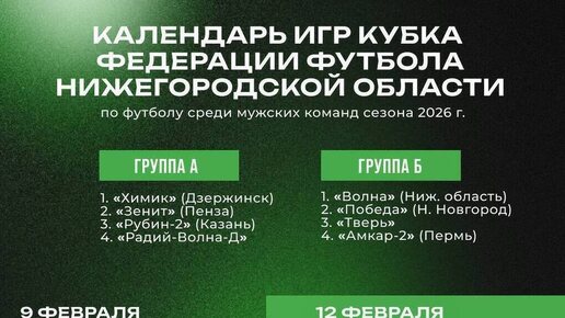 С 9 по 14 февраля в крытом манеже Центра спортивной подготовки на территории спортивной базы «Академия 52» будет разыгран традиционный Кубок Федерации футбола Нижегородской области. 8 команд разбили на 2 группы, каждая сыграет с каждой по одному матчу. • Группа А: «Химик» Дзержинск, «Зенит» Пенза, «Рубин-2» Казань, «Радий-Волна-Д» • Группа Б: «Победа» Нижний Новгород, «Тверь», «Амкар-2» Пермь, «Волна» Ниж. область. Календарь игр: 09 февраля10:00 «Радий-Волна–Д» - «Химик»12:00 «Зенит» - «Рубин-2»14:00...