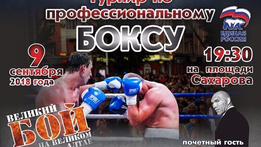 9 сентября в Барнауле, на площади Сахарова пройдет Международный турнир по профессиональному боксу «Великий бой на Великом Алтае». В соревнованиях примут участие боксеры из разных регионов страны и стран зарубежья. В качестве почетного гостя на турнир приедет Чемпион мира в тяжёлом весе по версии WBA, чемпион в тяжелой весовой категории по версии Паназиатской боксерской...