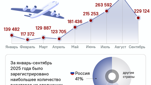 Лидером по числу прибывших остается Россия, на втором и третьем местах —Грузия и Иран. Число туристов, посетивших Армению в январе–августе 2025 года, превысило аналогичный показатель 2024 года. По данным Комитета по туризму, за восемь месяцев текущего года в страну прибыли 1 734 247 человек, что на 13 002 больше, чем за тот же период годом ранее (1 721 245). Лидером по числу прибывших остается Россия — Армению посетили 710 912 граждан, что составляет 41% от общего туристического потока. На втором месте — Грузия с показателем 213 483 человек (12%), на третьем — Иран (135 434 туриста, 8%)...