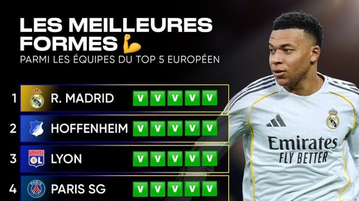 «Реал Мадрид», «Хоффенхайм», «Лион» и «ПСЖ» — единственные клубы из топ-5 лиг Европы, одержавшие 5 побед в 5 последних матчах своих