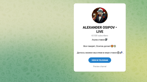 По просьбам наших клиентов сделали честный обзор на канал в телеграмм «Александр Осипов». Постарались раскрыть полностью "все карты" при анализе данного канала. Надеемся на ваш Лайк и комментарий(на какой ещё канал сделать обзор и разоблачение). Лидером нашего рейтинга каналов со ставками на спорт есть этот канал: 🔥№1 в РЕЙТИНГЕ🔥 - https://t.me/+iOJd2gnpgMdiNjIy Канал в телеграмм «Александр Осипов» создан 19 ноября 2020 года. Аудитория канала составляет 65 тыс. человек. Канал собирает до 5 тыс...