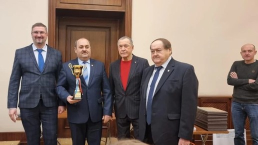 Торжественный момент вручения кубка Миллеровскому району: А. В. Попов, начальник отдела игровых видов спорта Минспорта