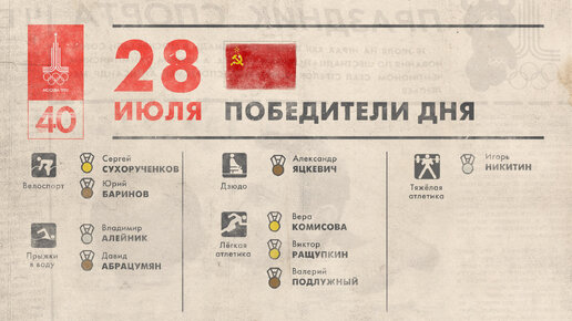 28 июля на московской Олимпиаде разыгрывалось 10 комплектов наград, из которых 5 – в легкой атлетике, по 1 в фехтовании, дзюдо, велоспорте, прыжкам в воду и тяжелой атлетике. Сергей Сухорученков стал олимпийским чемпионом в индивидуальной шоссейной гонке. Бронзу завоевал еще один наш спортсмен – Юрий Баринов. Сухорученков сейчас проживает в Санкт-Петербурге, его дочь Ольга Забелинская – трехкратный олимпийский призер в велоспорте. В прыжках в воду с 10-метровой вышки у нас серебро Владимира Алейника и бронза Давида Амбарцумяна...