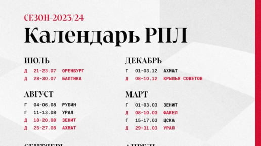 Расписание игр московского «Спартака» в РПЛ в сезоне 23/24