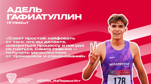 Адель Гафиатуллин — студент ПГУФКСиТ, мастер спорта по легкой атлетике в беге на 800 метров, победитель и призер студенческих и всероссийских стартов. Время знакомиться с ним! Как ты вообще попал в легкую атлетику, как развивался там твой путь до того, что есть сейчас? Попал в лёгкую атлетику в 2014 году, мне тогда было восемь лет. Привёл меня сосед. Я выбирал между шахматами и лёгкой атлетикой, оба занятия мне нравились. Чтобы определиться, мне сказали бросить монетку — и выпала лёгкая атлетика...