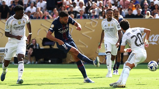 Встреча завершилась со счетом 4:0 в пользу парижан ВАШИНГТОН, 10 июля. /ТАСС/. Французский "Пари Сен-Жермен" со счетом 4:0 одержал разгромную победу над испанским "Реалом" в полуфинальном матче клубного чемпионата мира по футболу. Турнир проходит в США. Забитыми мячами отметились Фабиан Руис (6-я, 24-я минуты), Усман Дембеле (9) и Гонсалу Рамуш (88). Российский вратарь ПСЖ Матвей Сафонов остался на скамейке запасных. Начало матча было отложено на 10 минут из-за пробок. В связи с этим команды прибыли...