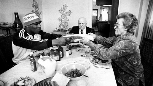Майк Тайсон и его приёмные родители за семейным ужином в Кэтскиле, в 1980-е годы. Родители Камиллы Эволд украинцы из тернопольщины Гнат и Настя Иващуки. Семья жила в городке Кэтскилл в 160 км от Нью-Йорка. В 1945 году сестра Камиллы бывшая замужем итальянцем познакомила ее с братом мужа Константино Дамато...