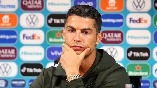 Роналду убрал спонсорскую кока-колу на пресс-конференции. Он жестко против сахара – даже не рекламирует его
