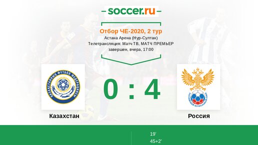 24 марта сборная России во втором матче отборочного тура чемпионата Европы-2020 разгромила в гостях команду Казахстана со счетом 4:0. Сборная России во втором матче отборочного тура чемпионата Европы-2020 разгромила команду Казахстана. Матч, состоявшийся 24 марта на стадионе "Астана-Арена" в Нур-Султане, завершился убедительной победой подопечных Станислава Черчесова со счетом 4:0. Казахстан - Россия: обзор матча После проигрыша бельгийцам и не очень убедительной игры в Брюсселе российскую...