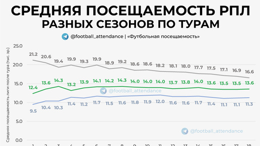 Продолжаю следить за динамикой изменения средней посещаемости как в разрезе туров, так и за всю истории. В сравнении с первой версией этого обзора (после 8-го тура) средняя аудитория нынешнего сезона РПЛ снизилась с 14319 зр./матч до 13607. Эта цифра является 4-й в истории Лиги. Напомню, что рекорд средней посещаемости российского футбола и РПЛ был установлен в сезоне-2018/19 (16817 зр./матч). Также напомню, что в сезоне-2019/20 могло быть ещё больше (до ковид-паузы – 17530 зр./матч), но из-за ковид-ограничений рекорд для полного сезона не был обновлён...