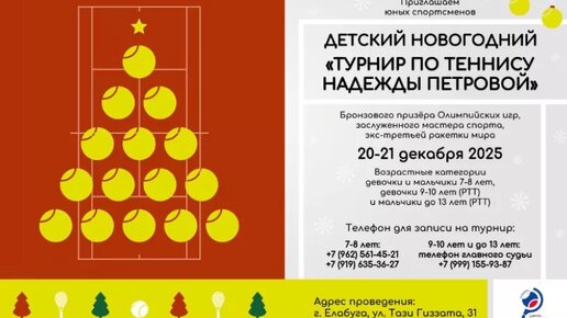 Открыта запись на "Новогодний детский турнир Надежды Петровой" в Елабуге. Приглашаем юных спортсменов к участию, а всех любителей тенниса - поддержать будущих чемпионов! Регистрируйтесь на новогодний детский турнир по большому теннису Надежды Петровой - заслуженного мастера спорта, легенды российского тенниса и бронзового призёра Олимпийских игр! Даты проведения - 20-21 декабря. В гости приедет ещё одна икона спорта - Елена Веснина, экс-первая ракетка мира! В рамках встречи состоятся выставочный матч и автограф-сессия со звёздами...