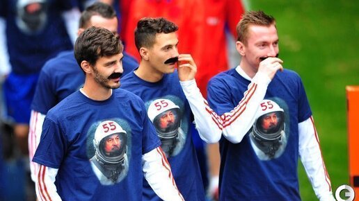 2 сентября главному тренеру национальной команды исполнилось 55 лет. Футболисты сборной России появились на сегодняшней тренировке в накладных усах и футболках, посвященных главному тренеру национальной команды Станиславу Черчесову. На футболках главный тренер, которому накануне исполнилось 55 лет, изображен в качестве космонавта с цифрами 55 на шлеме...