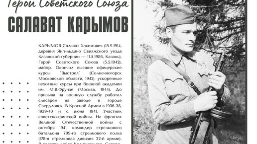 OH родился в тот год, когда на рубежах нашей страны загремели пушки первой мировой войны. Его отец — кузнец. Хаким из деревни Янгильдино, Кайбицкого района, Татарской республики — научил Салавата кузнечному ремеслу. И оно помогло молодому Карымову стать слесарем-стахановцем на производстве.