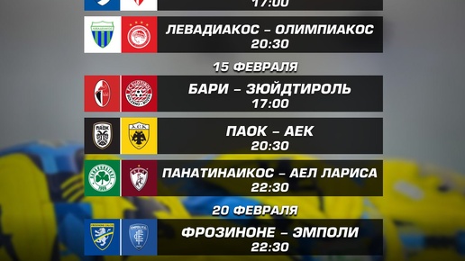 » 14 февраля в 17:00 Сампдория-Падова 14 февраля в 20:30 Левадиакос-Олимпиакос 15 февраля в 17:00 Бари-Зюйдтироль 15 февраля в 20:30 ПАОК-АЕК 15 февраля в 22:30 Панатинаикос-АЕЛ Лариса 20 февраля в 22:30 Фрозиноне-Эмполи...