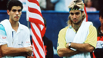 Эти двое не только доминировали в мужском теннисе на протяжении тринадцати лет, но, как и Борг с Макинроем, были полной противоположностью друг другу. Сампрас — образец теннисного профессионализма и звездный, избалованный Агасси провели на корте 34 поединка (20:14 в пользу Сампраса) и разыграли между собой пять финалов турниров «Большого шлема» (4:1 в пользу Пита-пистолета). «Пит был для меня одновременно и даром судьбы, и проклятьем», — позже вспоминал в своей книге Андре Агасси. «У нас были абсолютно разные стили игры...