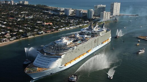 В начале 2019 года самым большим круизным лайнером в мире стал «Oasis of the Seas» компании Royal Caribbean. Он опередил своего предшественника, «Allure of the Seas», который считался самым большим лайнером в 2018 году. А до 2018 года первенство было у корабля «Harmony of the Seas». Бюджет строительства самого большого океанского лайнера составил 1,5 млрд. долларов. Эта цифра сравнима со стоимостью самого высокого небоскреба в мире, Бурдж-Халифы (Дубай). Размеры самого большого круизного лайнера. Длина корпуса «Oasis of the Seas» – 360 метров. Ширина – 66 метров. По высоте над поверхностью воды лайнер сравним со зданием в 24 этажа! Водоизмещение – более 220 тысяч тонн...