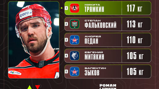 Продолжаю нашу интереснейшую подборку ⚡️ Самый тяжелый хоккеист — Никита Трямкин (117 кг), мощнейший защитник Лиги. Самый легкий — Дмитрий Дагестанский (65 кг)
