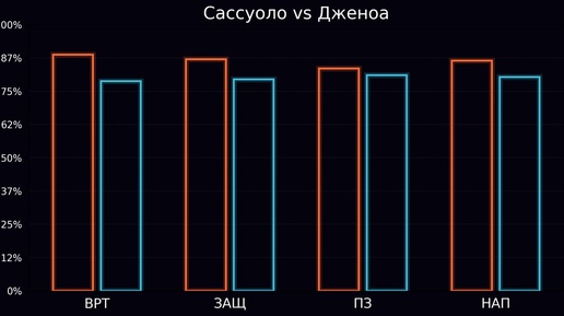 🔥 Сассуоло vs Дженоа ⚔️ Сравнение линий - Защита: 69% vs 63% - Полузащита: 66% vs 64% - Нападение: 69% vs 64% 🔀 Перекрёстное сравнение - Нападение Сассуоло vs Защита Дженоа: 69% vs 63% - Нападение Дженоа vs Защита Сассуоло: 64% vs 69% 🛡 Защитная функция - Сассуоло: 68% - Дженоа: 64% ⚔️ Атакующая функция - Сассуоло: 69% - Дженоа: 63%...