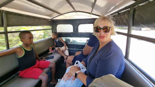 В аэропорту снова спрашивают американскую визу, хотя острова британские. Виза у меня в старом паспорте - он не старый, просто печати там ставить некуда, но пограничница решила найти место и нашла! Печать вошла не полностью, но читабельна. Супер! Дальше оплата экологического сбора по 10 долл. с человека. Ура! 151 страна в копилке! Муж читал, что из аэропорта можно уехать только на такси, но не верит в это, идёт спрашивать. Ему подтверждают, что автобусы, вернее, открытые маршрутки "сафари" на острове...