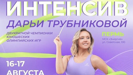 16-17 августа в Перми будет проходить интенсив по художественной гимнастике. На площадке МСК «Энергия» проведут занятия хореограф национальной сборной Кирилл Баркан, тренеры Яна Луконина и Дмитрий Степанчиков, олимпийская чемпионка Алина Макаренко и чемпионка Юношеских олимпийских игр Дарья Трубникова...
