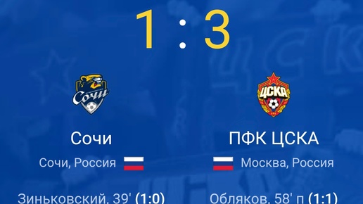 Команда Что не очень Где сильные стороны Сочи На предпоследнем/последнем месте турнирной таблицы. После смены тренера (Игорь Осинькин) пока нет ощутимого улучшения: поражение от «Крыльев Советов» 0:2, крупное поражение в Кубке России от «Динамо» 0:4. (Евро-Футбол) За последние 5-8 матчей часто пропускают, и не так часто забивают. (Спортс’’) Высокая мотивация. Нужно "отобраться" от дна, показать характер. Возможно, ставить более оборонительный рисунок, контратаки. ЦСКА Бывают ошибки, особенно в концовках или в защите — пропускают...