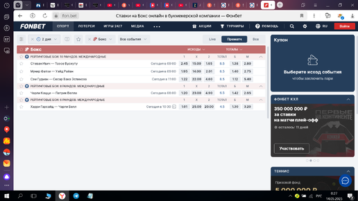 Представляю вашему вниманию кэфы на бои, которые прошли сегодня 14.05.2025 Главный бой Сэм Гудман - Сесар Вака Эспиноза, начнем с прематча, потом будут скрины некоторых боев лайва. Самое интересное по боям этого вечера, движуха: Мунир Фатхи открылся на Фоне с кф2.5 и его прям моментально прогрузили до 1.95 Вот скрин линии открытия и там еще был прикол: Фонбет дала на тб8.5 раундов Сэма Гудмана кф1.42, потом он стал 1,38 и они сразу же убрали прием ставок на тоталы и через 5 минут выдали правильные кэфы: в этот же момент на Олимпе на тм8...