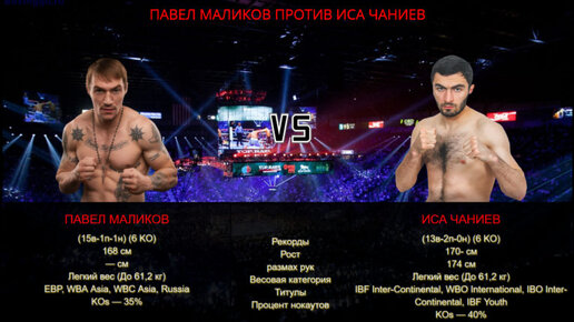 Павел Маликов (15в-1п-1н) (6 KO) - Иса Чаниев (13в-2п-0н) (6 KO)