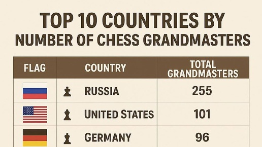 Топ 10 стран по количеству шахматистов гроссмейстеров.