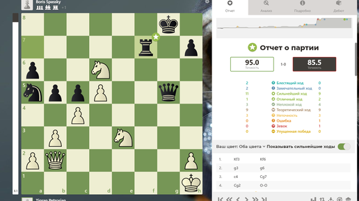 Партия отличная - играют лучшие шахматисты планеты: у каждого свой стиль: у Петросяна - более медлительный, взвешенный, у Спасского - эксцентричный, комбинационный. Но в этой игре красивее и интереснее сыграл Тигран Вартанович. Предлагаю посмотреть на 3 позиции из игры, попробовать найти лучшие ходы, а затем глянуть партию. Точность соперников, по мнению движка, 95% у белых и всего 85,5% у черных...