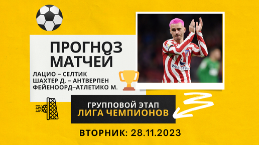 Прогноз матчей 🏆 Лига Чемпионов ⚽️ Лацио – Селтик, Шахтер Донецк – Антверпен, Фейеноорд – Атлетико Мадрид. Групповой этап, 5 тур. 28.11.2023 Лацио – Селтик прогноз на матч Группа E. ⏰ Начало: 20:45