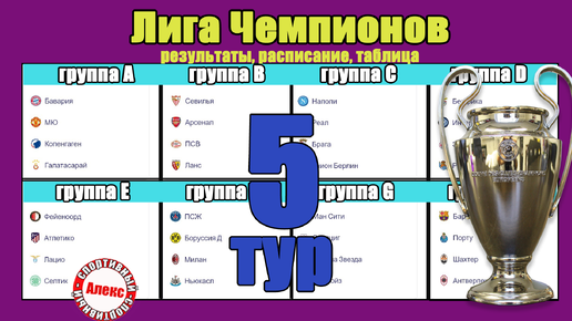 Футбол. Лига Чемпионов 2018-2019. 5 тур. Группы E. F. G. H. Результаты. Расписание. Таблицы.