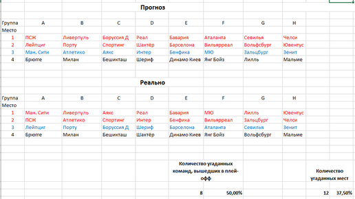 Результаты группового этапа нынешней Лиги Чемпионов УЕФА меняли сильно удивили. Я смог предварительно угадать только 8 команд, вышедших в плей-офф (обычно было 9-14), и 12 итоговых мест (обычно было 15-22), даже и в одной из групп я не угадал точного распределения мест. В прошлом году в одной группе были ПСЖ, Лейпциг и МЮ с Инстамбулом; и тогда дальше прошли ПСЖ и Лейпциг я думал и в этом году так будет, но другая команда Манчестера смогла обогнать и французов и немцев. Здесь у меня был первый промах...