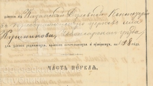 Село Кушниково. Метрическая книга об умерших за 1891-1917 гг. ГИА Чувашской Республики (ГИА ЧР), фонд № 557, опись № 8, дело № 136, стр. 153 скан. Метрическая книга, данная из Казанской Духовной Консистории в Преображенскую церковь села Кушникова Чебоксарского уезда для записи родившихся, браком сочетавшихся и умерших на 1898 год. Часть третия. О умерших. Стр. 163 скан. Август. № 37. 26 числа умер...