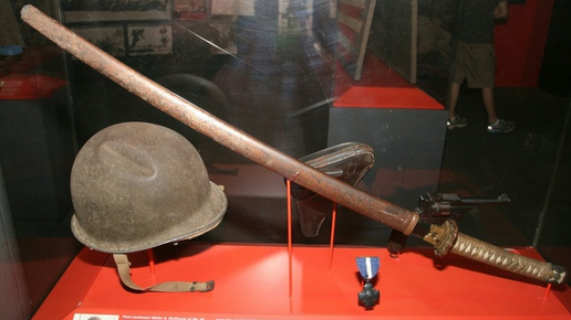 Американский боевой шлем М1 капитана Вальтера Макиленни, хранящийся в экспозиции Национального музея Второй мировой войны в Новом Орлеане, штат Луизиана. Рядом со шлемом, составляя с ним групповую композицию, выставлены японский армейский меч Син-гунто образца 1934 года, револьвер M1917 сорок пятого калибра и Крест Военно-морских сил - высшая награда Военно-морского министерства Соединенных Штатов. Капитан Вальтер Штауффер Макиленни служил в роте B 1-го батальона 5-го полка 1-й дивизии морской пехоты...