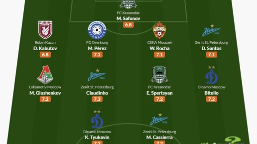В команду года вошли представители лишь семи клубов из шестнадцати. Завершился сезон 2023/2024 чемпионата России по футболу. Портал статистики Whoscored представил символическую сборную по итогам сезона, в которую вошли представители семи команд. Наибольшее представительство в команде сезона у чемпиона страны "Зенита" - три футболиста представляют этот клуб. А лучшая оценка в сезоне о полузащитника "Зенита" Клаудиньо (7.3 балла). Помимо Клаудиньо из "Зенита" в сборную сезона попали Матео Кассьерра и Дуглас Сантос...