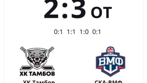 В драматичном поединке регулярного чемпионата ВХЛ хоккейный клуб "Тамбов" не смог вырваться вперед и проиграл петербургской команде "СКА-ВМФ" из Санкт-Петербурга. Несмотря на упорную борьбу и поддержку болельщиков, тамбовские хоккеисты уступили гостям в напряжённом противостоянии...