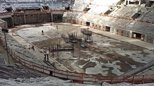 Начну с того, что «СКА Арена» вместимостью 21,5 тыс. человек станет самым большим хоккейным стадионом в мире (сейчас первое место удерживает «Белл-центр» в Монреале вместимостью 21288). Среди первых 48 хоккейных арен мира нет ни одной Российской! И вот наконец-то в Санкт-Петербурге на пр. Гагарина строится мега-супер хоккейная площадка. Думаю, снаружи все видели, как выглядит эта исполинская конструкция, а вот внутри... Сейчас, 8 сентября 2022 года, там вот так: Как видно, внутри самой чаши рабочих...