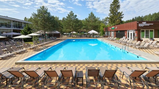 Звенигород. Обзор территории пансионата "Солнечная поляна". Гостевой корпус, бассейн и олени.