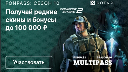Условия для заработка: - Это 18+, так как нужно регистрироваться в букмекерской конторе Fonbet (ставить ничего не нужно) - Нужно выполнять задания в играх CS2 и Dota 2, соответственно нужен аккаунт Steam и само собой установленные эти две игры. Как выполнены два этих условия, все становится предельно просто. - Заходим на главную страницу и ищем такой же баннер как вы видели выше https://fon.bet/s/jwxYlx - Нажимаем участвовать и привязываем аккаунт стима, для того что бы fonpass мог видеть наш прогресс в играх...