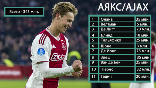 Сколько стоят полуфиналисты Лиги Чемпионов? У кого самый дорогой состав. Представим по 11 футболистов от каждого клуба, которые выходили в старте или на замену в четвертьфиналах. Начинаем с нидерландского Аякса. Вратарь Онана – 35 млн. Джоел Велтман - 5 млн. Де Лигт – 70 млн. (а ведь этому парню только 19 лет) Дейли Блинд – 18 млн. Тальяфико – 25 млн. 32 - летний Шоне обойдётся в 3 млн. Де Йонг – 75 млн. (как известно футболист именно за эту сумму был продан Барселоне) Зиеш – 35 млн. Ван де Бек – 25 млн...