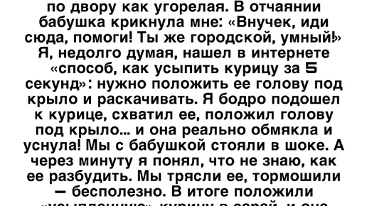 1. Куриный гипноз Моя бабушка, живущая в деревне, как- раз пыталась поймать курицу, чтобы посадить ее в сарай. Курица носилась по двору как угорелая. В отчаянии бабушка крикнула мне: «Внучек, иди сюда, помоги! Ты же городской, умный!» Я, недолго думая, нашел в интернете «способ, как усыпить курицу за 5 секунд»: нужно положить ее голову под крыло и раскачивать. Я бодро подошел к курице, схватил ее, положил голову под крыло... и она реально обмякла и уснула! Мы с бабушкой стояли в шоке. А через минуту я понял, что не знаю, как ее разбудить...