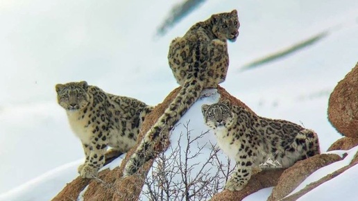 Самка снежного барса Метка, ее котенок и самец Хан. Республика Алтай, Южно-Чуйский хребет.